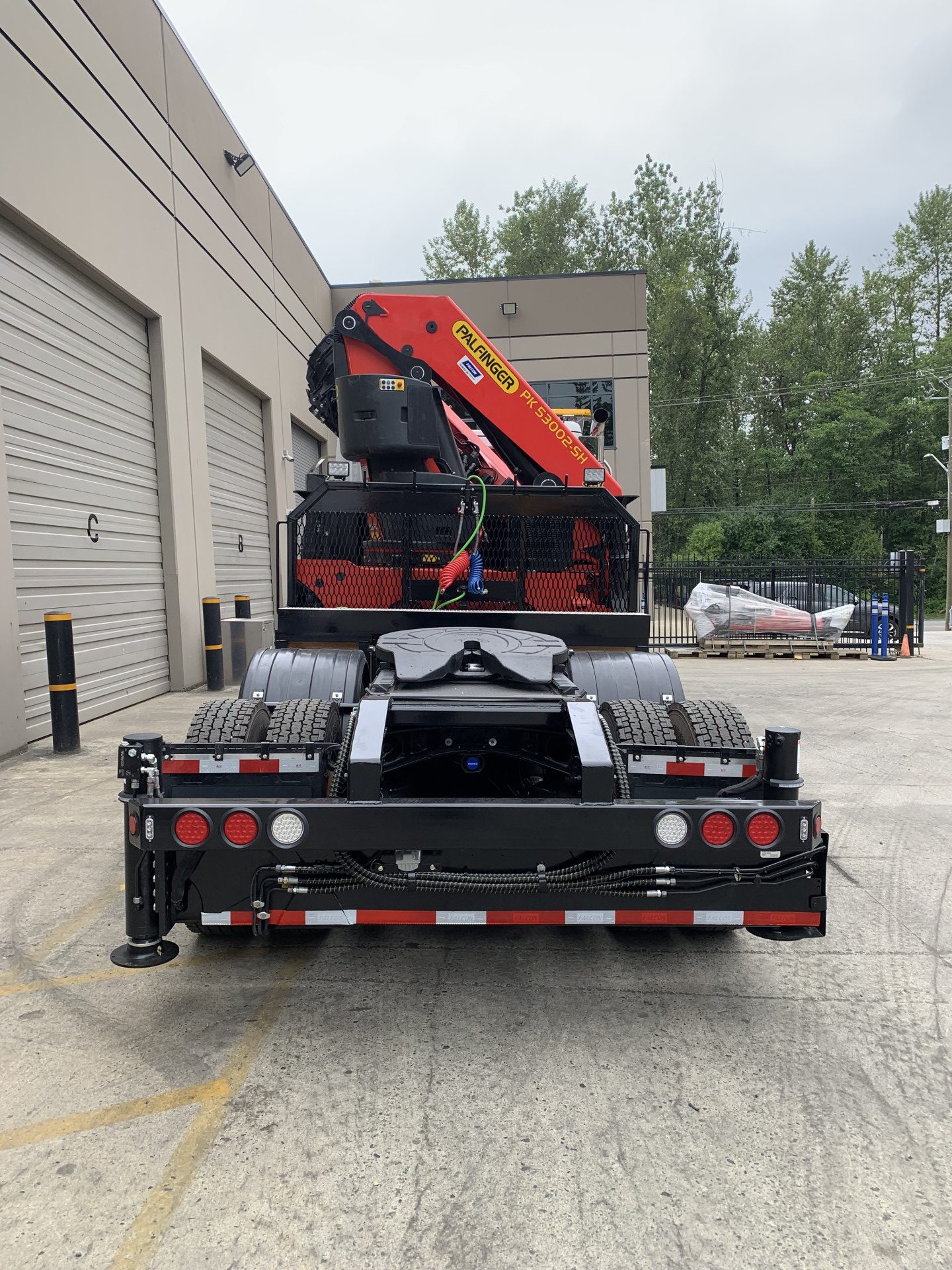 Falcon Custom Tractor Package & Subframe, 36” 5th wheel slide – low profile, 40” mesh bulkhead with LED Work Lights & Riggings hooks c/w chain tray, Rear ramps with integrated Aux Outriggers, Rear LED STT light bars , Two aluminum custom toolboxes, Dual Front Stabs with Cross Beam & Chrome Bumper